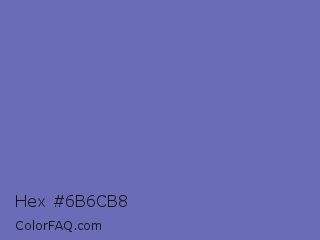 Hex #6b6cb8 Color is a normal blue color and the nearest color is Toolbox #746cc0. Hex code #6b6cb8 and RGB value is rgb(107,108,184). In RGB color space, this color is composed of 42% red, 42% green, 72% blue, In CMYK color space, this color is composed of 42% cyan, 41% magenta, 0% yellow , 28% black , In HSL color space, this color has a hue angle of 239° , 35% saturation and 57% lightness.