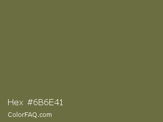 Hex #6b6e41 Color is a normal yellow color and the nearest color is Finch #626649. Hex code #6b6e41 and RGB value is rgb(107,110,65). In RGB color space, this color is composed of 42% red, 43% green, 25% blue, In CMYK color space, this color is composed of 3% cyan, 0% magenta, 41% yellow , 57% black , In HSL color space, this color has a hue angle of 64° , 26% saturation and 34% lightness.