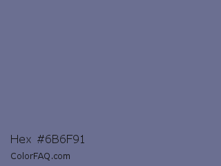 Hex #6b6f91 Color is a normal blue color and the nearest color is Dark Blue Gray #666699. Hex code #6b6f91 and RGB value is rgb(107,111,145). In RGB color space, this color is composed of 42% red, 44% green, 57% blue, In CMYK color space, this color is composed of 26% cyan, 23% magenta, 0% yellow , 43% black , In HSL color space, this color has a hue angle of 234° , 15% saturation and 49% lightness.