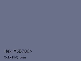 Hex #6b708a Color is a normal blue color and the nearest color is Storm Gray #717486. Hex code #6b708a and RGB value is rgb(107,112,138). In RGB color space, this color is composed of 42% red, 44% green, 54% blue, In CMYK color space, this color is composed of 22% cyan, 19% magenta, 0% yellow , 46% black , In HSL color space, this color has a hue angle of 230° , 13% saturation and 48% lightness.