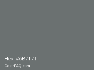 Hex #6b7171 Color is a normal cyan color and the nearest color is Dove Gray #6d6c6c. Hex code #6b7171 and RGB value is rgb(107,113,113). In RGB color space, this color is composed of 42% red, 44% green, 44% blue, In CMYK color space, this color is composed of 5% cyan, 0% magenta, 0% yellow , 56% black , In HSL color space, this color has a hue angle of 180° , 3% saturation and 43% lightness.