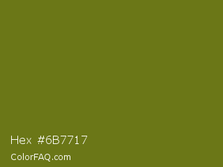 Hex #6b7717 Color is a dark yellow color and the nearest color is Fern Frond #657220. Hex code #6b7717 and RGB value is rgb(107,119,23). In RGB color space, this color is composed of 42% red, 47% green, 9% blue, In CMYK color space, this color is composed of 10% cyan, 0% magenta, 81% yellow , 53% black , In HSL color space, this color has a hue angle of 68° , 68% saturation and 28% lightness.