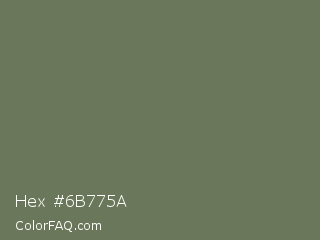 Hex #6b775a Color is a normal green color and the nearest color is Willow Grove #65745d. Hex code #6b775a and RGB value is rgb(107,119,90). In RGB color space, this color is composed of 42% red, 47% green, 35% blue, In CMYK color space, this color is composed of 10% cyan, 0% magenta, 24% yellow , 53% black , In HSL color space, this color has a hue angle of 85° , 14% saturation and 41% lightness.