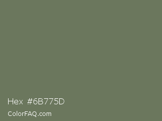 Hex #6b775d Color is a normal green color and the nearest color is Willow Grove #65745d. Hex code #6b775d and RGB value is rgb(107,119,93). In RGB color space, this color is composed of 42% red, 47% green, 36% blue, In CMYK color space, this color is composed of 10% cyan, 0% magenta, 22% yellow , 53% black , In HSL color space, this color has a hue angle of 88° , 12% saturation and 42% lightness.