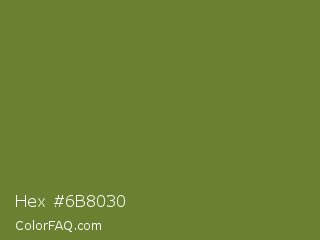 Hex #6b8030 Color is a normal lime color and the nearest color is Crete #737829. Hex code #6b8030 and RGB value is rgb(107,128,48). In RGB color space, this color is composed of 42% red, 50% green, 19% blue, In CMYK color space, this color is composed of 16% cyan, 0% magenta, 63% yellow , 50% black , In HSL color space, this color has a hue angle of 76° , 45% saturation and 35% lightness.