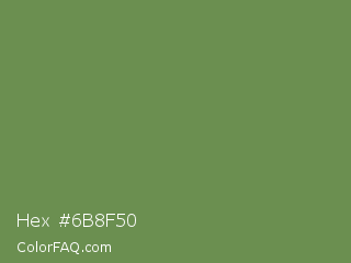 Hex #6b8f50 Color is a normal green color and the nearest color is Palm Leaf #6f9940. Hex code #6b8f50 and RGB value is rgb(107,143,80). In RGB color space, this color is composed of 42% red, 56% green, 31% blue, In CMYK color space, this color is composed of 25% cyan, 0% magenta, 44% yellow , 44% black , In HSL color space, this color has a hue angle of 94° , 28% saturation and 44% lightness.