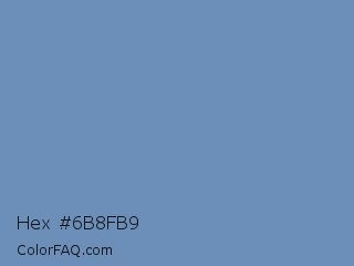 Hex #6b8fb9 Color is a normal blue color and the nearest color is Ship Cove #788bba. Hex code #6b8fb9 and RGB value is rgb(107,143,185). In RGB color space, this color is composed of 42% red, 56% green, 73% blue, In CMYK color space, this color is composed of 42% cyan, 23% magenta, 0% yellow , 27% black , In HSL color space, this color has a hue angle of 212° , 36% saturation and 57% lightness.