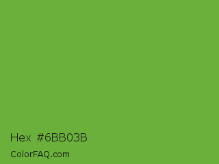 Hex #6bb03b Color is a normal green color and the nearest color is Green RYB #66b032. Hex code #6bb03b and RGB value is rgb(107,176,59). In RGB color space, this color is composed of 42% red, 69% green, 23% blue, In CMYK color space, this color is composed of 39% cyan, 0% magenta, 66% yellow , 31% black , In HSL color space, this color has a hue angle of 95° , 50% saturation and 46% lightness.