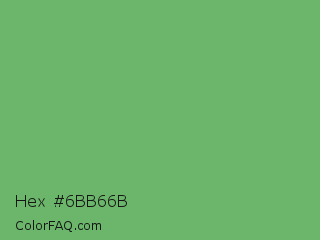 Hex #6bb66b Color is a normal green color and the nearest color is Fern #63b76c. Hex code #6bb66b and RGB value is rgb(107,182,107). In RGB color space, this color is composed of 42% red, 71% green, 42% blue, In CMYK color space, this color is composed of 41% cyan, 0% magenta, 41% yellow , 29% black , In HSL color space, this color has a hue angle of 120° , 34% saturation and 57% lightness.