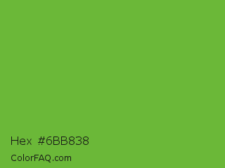 Hex #6bb838 Color is a normal green color and the nearest color is Green RYB #66b032. Hex code #6bb838 and RGB value is rgb(107,184,56). In RGB color space, this color is composed of 42% red, 72% green, 22% blue, In CMYK color space, this color is composed of 42% cyan, 0% magenta, 70% yellow , 28% black , In HSL color space, this color has a hue angle of 96° , 53% saturation and 47% lightness.