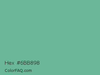 Hex #6bb898 Color is a normal green color and the nearest color is Silver Tree #66b58f. Hex code #6bb898 and RGB value is rgb(107,184,152). In RGB color space, this color is composed of 42% red, 72% green, 60% blue, In CMYK color space, this color is composed of 42% cyan, 0% magenta, 17% yellow , 28% black , In HSL color space, this color has a hue angle of 155° , 35% saturation and 57% lightness.