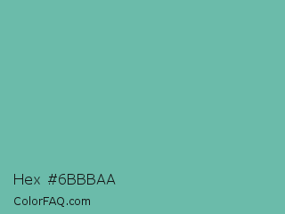 Hex #6bbbaa Color is a normal cyan color and the nearest color is Tradewind #5fb3ac. Hex code #6bbbaa and RGB value is rgb(107,187,170). In RGB color space, this color is composed of 42% red, 73% green, 67% blue, In CMYK color space, this color is composed of 43% cyan, 0% magenta, 9% yellow , 27% black , In HSL color space, this color has a hue angle of 167° , 37% saturation and 58% lightness.