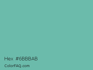 Hex #6bbbab Color is a normal cyan color and the nearest color is Tradewind #5fb3ac. Hex code #6bbbab and RGB value is rgb(107,187,171). In RGB color space, this color is composed of 42% red, 73% green, 67% blue, In CMYK color space, this color is composed of 43% cyan, 0% magenta, 9% yellow , 27% black , In HSL color space, this color has a hue angle of 168° , 37% saturation and 58% lightness.