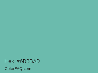 Hex #6bbbad Color is a normal cyan color and the nearest color is Tradewind #5fb3ac. Hex code #6bbbad and RGB value is rgb(107,187,173). In RGB color space, this color is composed of 42% red, 73% green, 68% blue, In CMYK color space, this color is composed of 43% cyan, 0% magenta, 7% yellow , 27% black , In HSL color space, this color has a hue angle of 170° , 37% saturation and 58% lightness.