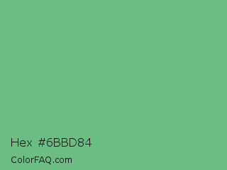 Hex #6bbd84 Color is a normal green color and the nearest color is Iguana Green #71bc78. Hex code #6bbd84 and RGB value is rgb(107,189,132). In RGB color space, this color is composed of 42% red, 74% green, 52% blue, In CMYK color space, this color is composed of 43% cyan, 0% magenta, 30% yellow , 26% black , In HSL color space, this color has a hue angle of 138° , 38% saturation and 58% lightness.