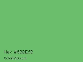 Hex #6bbe6b Color is a normal green color and the nearest color is Fern #63b76c. Hex code #6bbe6b and RGB value is rgb(107,190,107). In RGB color space, this color is composed of 42% red, 75% green, 42% blue, In CMYK color space, this color is composed of 44% cyan, 0% magenta, 44% yellow , 25% black , In HSL color space, this color has a hue angle of 120° , 39% saturation and 58% lightness.