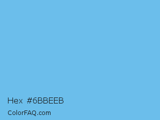Hex #6bbeeb Color is a light blue color and the nearest color is Aero #7cb9e8. Hex code #6bbeeb and RGB value is rgb(107,190,235). In RGB color space, this color is composed of 42% red, 75% green, 92% blue, In CMYK color space, this color is composed of 54% cyan, 19% magenta, 0% yellow , 8% black , In HSL color space, this color has a hue angle of 201° , 76% saturation and 67% lightness.