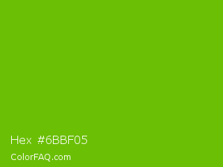 Hex #6bbf05 Color is a normal green color and the nearest color is Lima #76bd17. Hex code #6bbf05 and RGB value is rgb(107,191,5). In RGB color space, this color is composed of 42% red, 75% green, 2% blue, In CMYK color space, this color is composed of 44% cyan, 0% magenta, 97% yellow , 25% black , In HSL color space, this color has a hue angle of 87° , 95% saturation and 38% lightness.