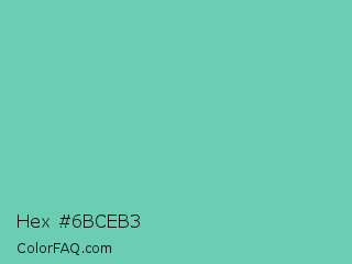 Hex #6bceb3 Color is a light cyan color and the nearest color is Medium Aquamarine #66ddaa. Hex code #6bceb3 and RGB value is rgb(107,206,179). In RGB color space, this color is composed of 42% red, 81% green, 70% blue, In CMYK color space, this color is composed of 48% cyan, 0% magenta, 13% yellow , 19% black , In HSL color space, this color has a hue angle of 164° , 50% saturation and 61% lightness.