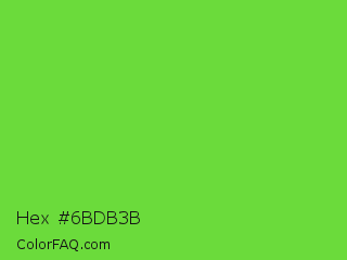 Hex #6bdb3b Color is a normal green color and the nearest color is Kiwi #8ee53f. Hex code #6bdb3b and RGB value is rgb(107,219,59). In RGB color space, this color is composed of 42% red, 86% green, 23% blue, In CMYK color space, this color is composed of 51% cyan, 0% magenta, 73% yellow , 14% black , In HSL color space, this color has a hue angle of 102° , 69% saturation and 55% lightness.