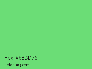 Hex #6bdd76 Color is a light green color and the nearest color is Pastel Green #77dd77. Hex code #6bdd76 and RGB value is rgb(107,221,118). In RGB color space, this color is composed of 42% red, 87% green, 46% blue, In CMYK color space, this color is composed of 52% cyan, 0% magenta, 47% yellow , 13% black , In HSL color space, this color has a hue angle of 126° , 63% saturation and 64% lightness.