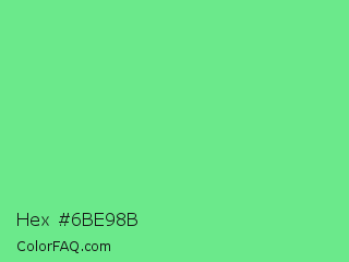 Hex #6be98b Color is a light green color and the nearest color is Very Light Malachite Green #64e986. Hex code #6be98b and RGB value is rgb(107,233,139). In RGB color space, this color is composed of 42% red, 91% green, 55% blue, In CMYK color space, this color is composed of 54% cyan, 0% magenta, 40% yellow , 9% black , In HSL color space, this color has a hue angle of 135° , 74% saturation and 67% lightness.