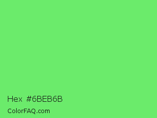Hex #6beb6b Color is a light green color and the nearest color is Screamin Green #66ff66. Hex code #6beb6b and RGB value is rgb(107,235,107). In RGB color space, this color is composed of 42% red, 92% green, 42% blue, In CMYK color space, this color is composed of 54% cyan, 0% magenta, 54% yellow , 8% black , In HSL color space, this color has a hue angle of 120° , 76% saturation and 67% lightness.