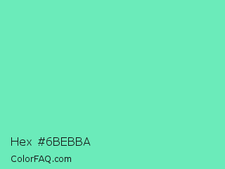 Hex #6bebba Color is a light green color and the nearest color is Medium Aquamarine #66ddaa. Hex code #6bebba and RGB value is rgb(107,235,186). In RGB color space, this color is composed of 42% red, 92% green, 73% blue, In CMYK color space, this color is composed of 54% cyan, 0% magenta, 21% yellow , 8% black , In HSL color space, this color has a hue angle of 157° , 76% saturation and 67% lightness.