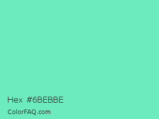 Hex #6bebbe Color is a light green color and the nearest color is Medium Aquamarine #66ddaa. Hex code #6bebbe and RGB value is rgb(107,235,190). In RGB color space, this color is composed of 42% red, 92% green, 75% blue, In CMYK color space, this color is composed of 54% cyan, 0% magenta, 19% yellow , 8% black , In HSL color space, this color has a hue angle of 159° , 76% saturation and 67% lightness.