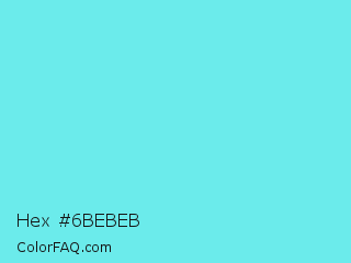 Hex #6bebeb Color is a light cyan color and the nearest color is Turquoise Blue #6cdae7. Hex code #6bebeb and RGB value is rgb(107,235,235). In RGB color space, this color is composed of 42% red, 92% green, 92% blue, In CMYK color space, this color is composed of 54% cyan, 0% magenta, 0% yellow , 8% black , In HSL color space, this color has a hue angle of 180° , 76% saturation and 67% lightness.
