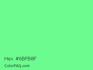 Hex #6bfb8f Color is a light green color and the nearest color is Very Light Malachite Green #64e986. Hex code #6bfb8f and RGB value is rgb(107,251,143). In RGB color space, this color is composed of 42% red, 98% green, 56% blue, In CMYK color space, this color is composed of 57% cyan, 0% magenta, 43% yellow , 2% black , In HSL color space, this color has a hue angle of 135° , 95% saturation and 70% lightness.
