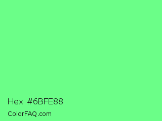 Hex #6bfe88 Color is a light green color and the nearest color is Very Light Malachite Green #64e986. Hex code #6bfe88 and RGB value is rgb(107,254,136). In RGB color space, this color is composed of 42% red, 100% green, 53% blue, In CMYK color space, this color is composed of 58% cyan, 0% magenta, 46% yellow , 0% black , In HSL color space, this color has a hue angle of 132° , 99% saturation and 71% lightness.