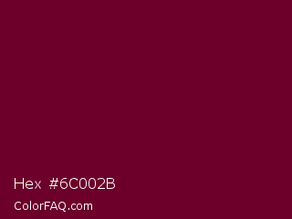 Hex #6c002b Color is a very dark rose color and the nearest color is Black Rose #67032d. Hex code #6c002b and RGB value is rgb(108,0,43). In RGB color space, this color is composed of 42% red, 0% green, 17% blue, In CMYK color space, this color is composed of 0% cyan, 100% magenta, 60% yellow , 58% black , In HSL color space, this color has a hue angle of 336° , 100% saturation and 21% lightness.