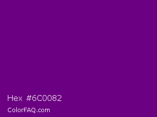 Hex #6c0082 Color is a dark purple color and the nearest color is Patriarch #800080. Hex code #6c0082 and RGB value is rgb(108,0,130). In RGB color space, this color is composed of 42% red, 0% green, 51% blue, In CMYK color space, this color is composed of 17% cyan, 100% magenta, 0% yellow , 49% black , In HSL color space, this color has a hue angle of 290° , 100% saturation and 25% lightness.