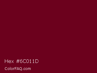Hex #6c011d Color is a very dark rose color and the nearest color is Venetian Red #72010f. Hex code #6c011d and RGB value is rgb(108,1,29). In RGB color space, this color is composed of 42% red, 0% green, 11% blue, In CMYK color space, this color is composed of 0% cyan, 99% magenta, 73% yellow , 58% black , In HSL color space, this color has a hue angle of 344° , 98% saturation and 21% lightness.