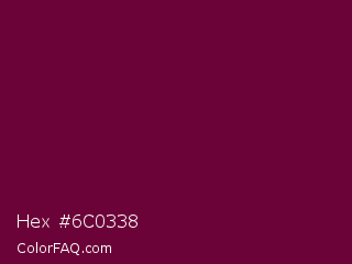 Hex #6c0338 Color is a very dark rose color and the nearest color is Tyrian Purple #66023c. Hex code #6c0338 and RGB value is rgb(108,3,56). In RGB color space, this color is composed of 42% red, 1% green, 22% blue, In CMYK color space, this color is composed of 0% cyan, 97% magenta, 48% yellow , 58% black , In HSL color space, this color has a hue angle of 330° , 95% saturation and 22% lightness.