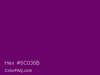 Hex #6c036b Color is a very dark magenta color and the nearest color is Patriarch #800080. Hex code #6c036b and RGB value is rgb(108,3,107). In RGB color space, this color is composed of 42% red, 1% green, 42% blue, In CMYK color space, this color is composed of 0% cyan, 97% magenta, 1% yellow , 58% black , In HSL color space, this color has a hue angle of 301° , 95% saturation and 22% lightness.