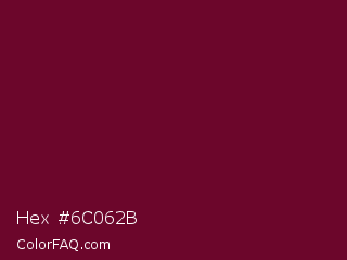 Hex #6c062b Color is a very dark rose color and the nearest color is Black Rose #67032d. Hex code #6c062b and RGB value is rgb(108,6,43). In RGB color space, this color is composed of 42% red, 2% green, 17% blue, In CMYK color space, this color is composed of 0% cyan, 94% magenta, 60% yellow , 58% black , In HSL color space, this color has a hue angle of 338° , 89% saturation and 22% lightness.
