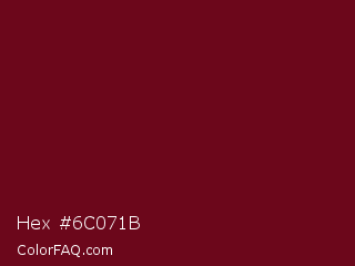 Hex #6c071b Color is a dark red color and the nearest color is Venetian Red #72010f. Hex code #6c071b and RGB value is rgb(108,7,27). In RGB color space, this color is composed of 42% red, 3% green, 11% blue, In CMYK color space, this color is composed of 0% cyan, 94% magenta, 75% yellow , 58% black , In HSL color space, this color has a hue angle of 348° , 88% saturation and 23% lightness.