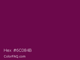 Hex #6c084b Color is a dark magenta color and the nearest color is Pompadour #660045. Hex code #6c084b and RGB value is rgb(108,8,75). In RGB color space, this color is composed of 42% red, 3% green, 29% blue, In CMYK color space, this color is composed of 0% cyan, 93% magenta, 31% yellow , 58% black , In HSL color space, this color has a hue angle of 320° , 86% saturation and 23% lightness.