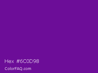 Hex #6c0d98 Color is a normal purple color and the nearest color is Purple #660099. Hex code #6c0d98 and RGB value is rgb(108,13,152). In RGB color space, this color is composed of 42% red, 5% green, 60% blue, In CMYK color space, this color is composed of 29% cyan, 91% magenta, 0% yellow , 40% black , In HSL color space, this color has a hue angle of 281° , 84% saturation and 32% lightness.