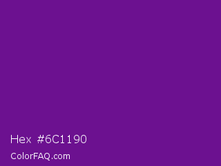 Hex #6c1190 Color is a normal purple color and the nearest color is Seance #731e8f. Hex code #6c1190 and RGB value is rgb(108,17,144). In RGB color space, this color is composed of 42% red, 7% green, 56% blue, In CMYK color space, this color is composed of 25% cyan, 88% magenta, 0% yellow , 44% black , In HSL color space, this color has a hue angle of 283° , 79% saturation and 32% lightness.