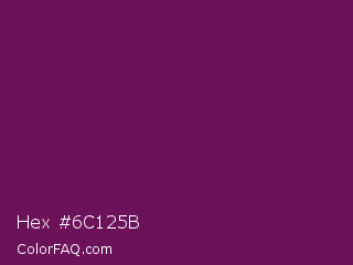 Hex #6c125b Color is a dark magenta color and the nearest color is Pansy Purple #78184a. Hex code #6c125b and RGB value is rgb(108,18,91). In RGB color space, this color is composed of 42% red, 7% green, 36% blue, In CMYK color space, this color is composed of 0% cyan, 83% magenta, 16% yellow , 58% black , In HSL color space, this color has a hue angle of 311° , 71% saturation and 25% lightness.