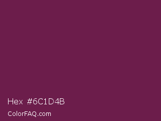 Hex #6c1d4b Color is a dark magenta color and the nearest color is Tawny Port #692545. Hex code #6c1d4b and RGB value is rgb(108,29,75). In RGB color space, this color is composed of 42% red, 11% green, 29% blue, In CMYK color space, this color is composed of 0% cyan, 73% magenta, 31% yellow , 58% black , In HSL color space, this color has a hue angle of 325° , 58% saturation and 27% lightness.