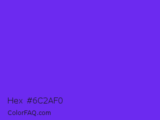 Hex #6c2af0 Color is a normal indigo color and the nearest color is Blue Violet #8a2be2. Hex code #6c2af0 and RGB value is rgb(108,42,240). In RGB color space, this color is composed of 42% red, 16% green, 94% blue, In CMYK color space, this color is composed of 55% cyan, 83% magenta, 0% yellow , 6% black , In HSL color space, this color has a hue angle of 260° , 87% saturation and 55% lightness.