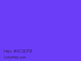 Hex #6c3df8 Color is a light indigo color and the nearest color is Majorelle Blue #6050dc. Hex code #6c3df8 and RGB value is rgb(108,61,248). In RGB color space, this color is composed of 42% red, 24% green, 97% blue, In CMYK color space, this color is composed of 56% cyan, 75% magenta, 0% yellow , 3% black , In HSL color space, this color has a hue angle of 255° , 93% saturation and 61% lightness.