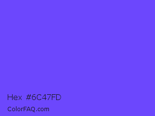 Hex #6c47fd Color is a light indigo color and the nearest color is Very Light Blue #6666ff. Hex code #6c47fd and RGB value is rgb(108,71,253). In RGB color space, this color is composed of 42% red, 28% green, 99% blue, In CMYK color space, this color is composed of 57% cyan, 72% magenta, 0% yellow , 1% black , In HSL color space, this color has a hue angle of 252° , 98% saturation and 64% lightness.