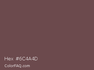 Hex #6c4a4d Color is a normal red color and the nearest color is Ferra #704f50. Hex code #6c4a4d and RGB value is rgb(108,74,77). In RGB color space, this color is composed of 42% red, 29% green, 30% blue, In CMYK color space, this color is composed of 0% cyan, 31% magenta, 29% yellow , 58% black , In HSL color space, this color has a hue angle of 355° , 19% saturation and 36% lightness.