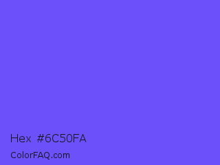 Hex #6c50fa Color is a light indigo color and the nearest color is Very Light Blue #6666ff. Hex code #6c50fa and RGB value is rgb(108,80,250). In RGB color space, this color is composed of 42% red, 31% green, 98% blue, In CMYK color space, this color is composed of 57% cyan, 68% magenta, 0% yellow , 2% black , In HSL color space, this color has a hue angle of 250° , 94% saturation and 65% lightness.