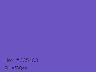 Hex #6c54c3 Color is a normal indigo color and the nearest color is Slate Blue #6a5acd. Hex code #6c54c3 and RGB value is rgb(108,84,195). In RGB color space, this color is composed of 42% red, 33% green, 76% blue, In CMYK color space, this color is composed of 45% cyan, 57% magenta, 0% yellow , 24% black , In HSL color space, this color has a hue angle of 253° , 48% saturation and 55% lightness.